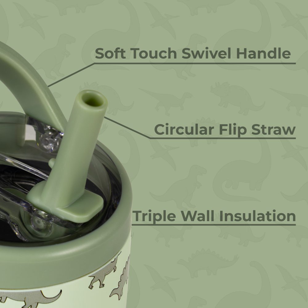 The HydroJug Sport 14oz in Dinosaur is built to keep kids refreshed through school, playdates, and big adventures. With its soft green base covered in friendly dinosaur illustrations, this compact water bottle adds prehistoric fun that little explorers will love while delivering durability parents can trust. Sized perfectly for small hands, the 14oz Sport Bottle is lightweight and easy to carry thanks to its wide, kid-friendly handle. It���s completely leakproof with the straw down and fits easily in car seats, cup holders, and backpacks ��� no spills, no stress. Made from 18/8 stainless steel with triple-wall insulation, it keeps drinks cold for hours, while the dishwasher-safe body makes cleanup quick and easy. Tough enough for everyday use and playful enough for kids, Dinosaur insulated bottle is hydration designed for little adventurers and peace of mind for parents. Dimensions: 3" x 3" x 6.89" Base diameter: 2.76" Capacity: 14 ounces of water ~ 415 mL Weight: 12.5oz ��� WARNING: CHOKING HAZARD ��� Small Parts. This product contains small components that may pose a choking risk. Not suitable for children under 3 years old . Inspect regularly for damage. For questions or concerns, contact customer support.