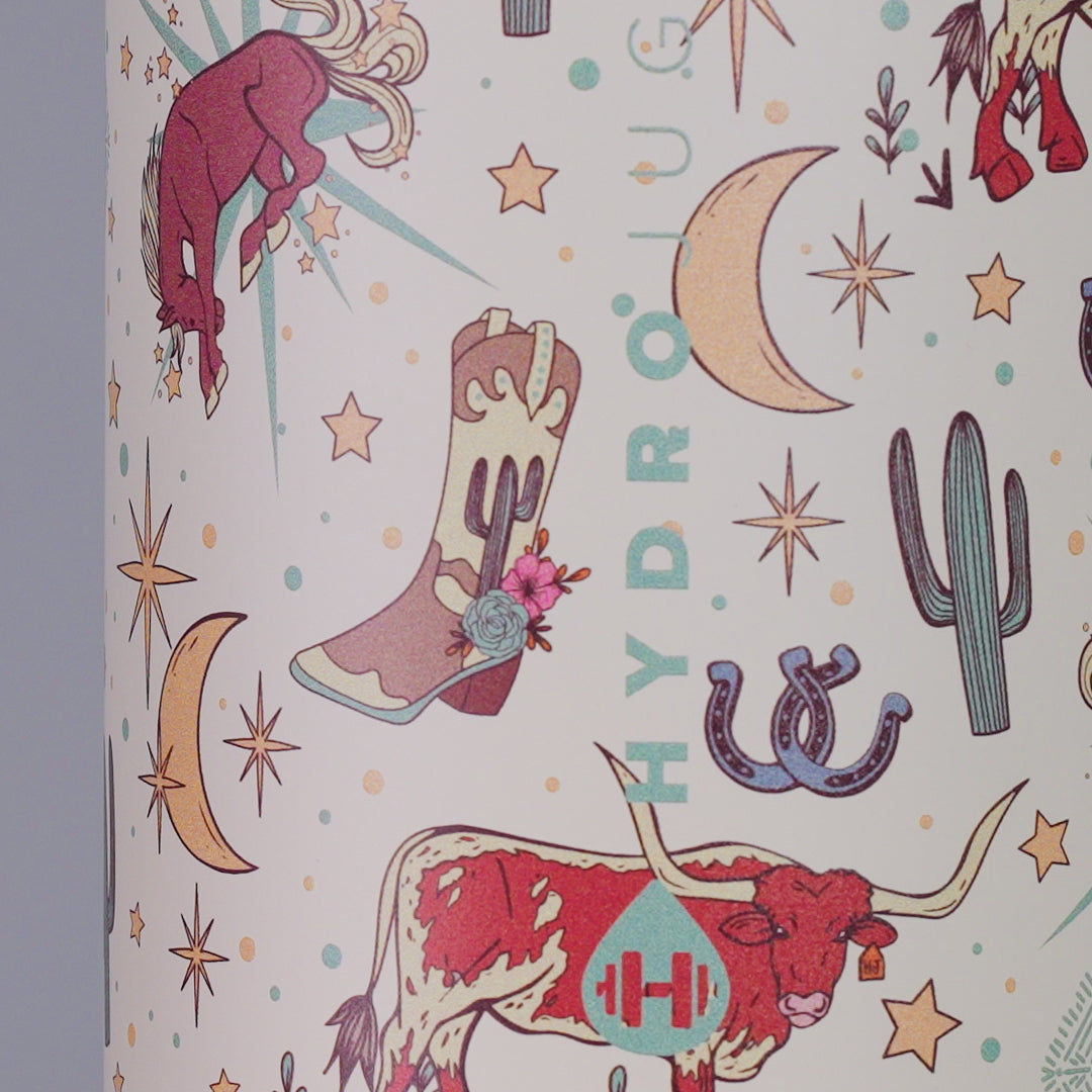 Designed for movement and performance, the HydroJug Sport 40oz in Rodeo combines durability with a bold western look. With its cream base decorated with longhorns, boots, cacti, stars, and moons, this insulated water bottle adds a rugged touch while delivering reliable hydration for workouts, commutes, or long days outdoors. The 40oz capacity provides all-day hydration with fewer refills, making it ideal for active lifestyles. Built for convenience, the Sport bottle is completely leakproof with the straw down, fits securely in most cupholders, and features an ergonomic bucket handle for a strong, comfortable grip wherever life takes you. Constructed from 18/8 stainless steel with triple-wall insulation, the Rodeo tumbler keeps drinks cold for hours. A protective rubber base enhances durability and stability, while the dishwasher-safe design makes cleanup simple. Practical, rugged, and dependable, it���s hydration made for training, commuting, and everything in between. Dimensions: 4.78" x 4.78" x 10.8" Base diameter: 3.14" Capacity: 40 ounces of water ~ 1182 mL Weight: 20oz
