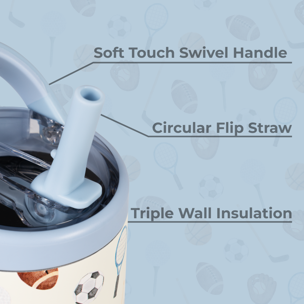 The HydroJug Sport 14oz in Sports is made to keep up with kids through school days, practices, and playtime. With its cream base decorated with basketballs, soccer balls, footballs, baseball gloves, and more, this compact water bottle brings athletic fun to every sip while delivering the durability parents trust. Sized perfectly for kids, the 14oz Sport Bottle is lightweight and easy to carry, even for small hands, thanks to its wide, kid-friendly handle. It���s completely leakproof with the straw down and fits easily in car seats, cup holders, and backpacks ��� no juggling required. Made from 18/8 stainless steel with triple-wall insulation, it keeps drinks cold for hours, while the dishwasher-safe build makes cleanup simple. Built tough for everyday use and playful enough for young athletes, Sports insulated bottle is hydration designed for busy parents and active kids. Dimensions: 3" x 3" x 6.89" Base diameter: 2.76" Capacity: 14 ounces of water ~ 415 mL Weight: 12.5oz ��� WARNING: CHOKING HAZARD ��� Small Parts. This product contains small components that may pose a choking risk. Not suitable for children under 3 years old . Inspect regularly for damage. For questions or concerns, contact customer support.