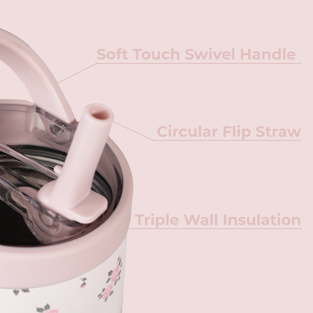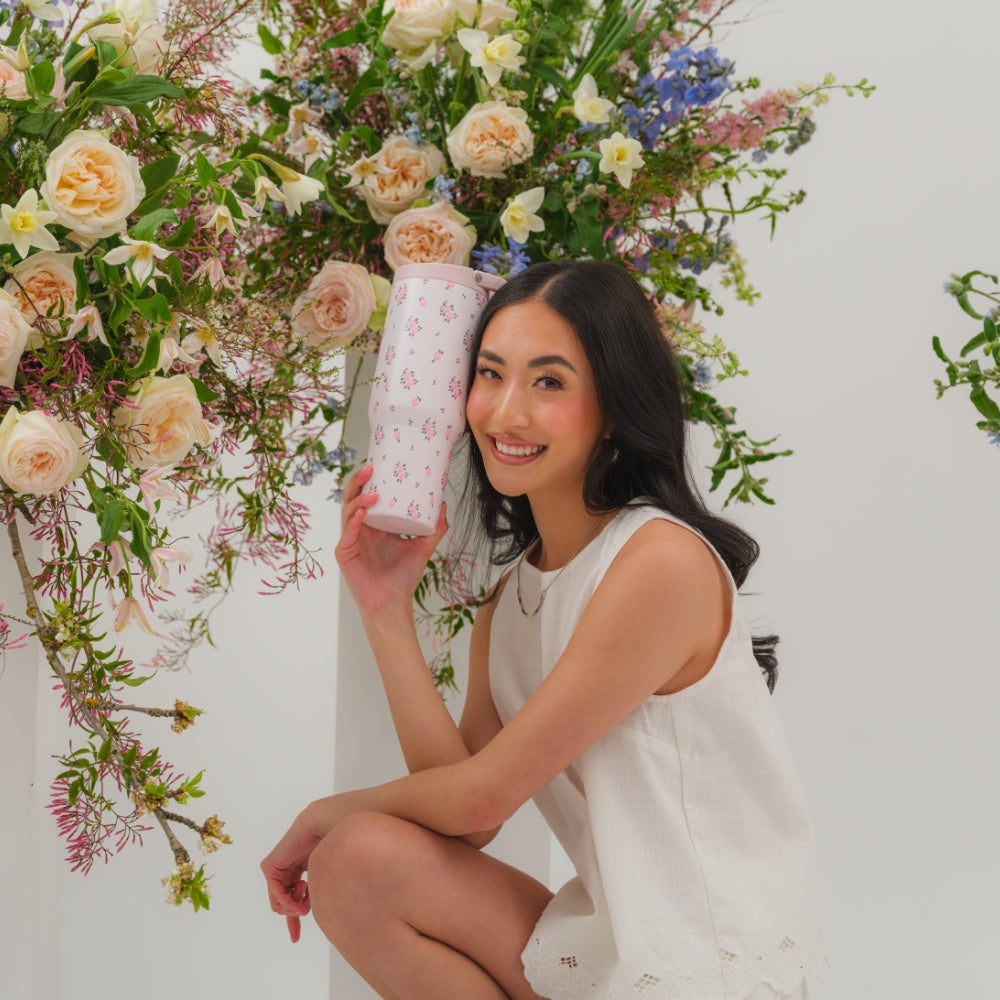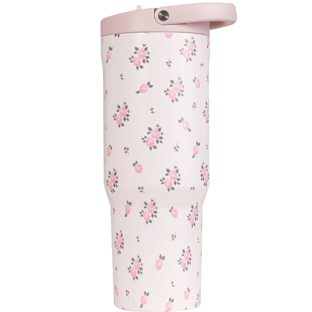 Stay on track with hydration using the HydroJug Sport 40oz in Wildrose. With its cream base decorated with soft pink roses and green accents, this water bottle adds a subtle design touch while delivering the capacity and durability you need for workouts, office days, or weekend outings. The 40oz size provides maximum hydration with fewer refills, making it ideal for active lifestyles. Built for movement, the insulated water bottle is completely leakproof with the straw down, fits in most cupholders, and features an ergonomic bucket handle for secure, comfortable carrying wherever the day takes you. Constructed from 18/8 stainless steel with triple-wall insulation, the Wildrose tumbler keeps drinks cold for hours. A protective rubber base adds stability and toughness, while the dishwasher-safe build makes cleanup simple. Reliable, durable, and versatile, it���s hydration designed to perform in every routine. Dimensions: 4.78" x 4.78" x 10.8" Base diameter: 3.14" Capacity: 40 ounces of water ~ 1182 mL Weight: 20oz